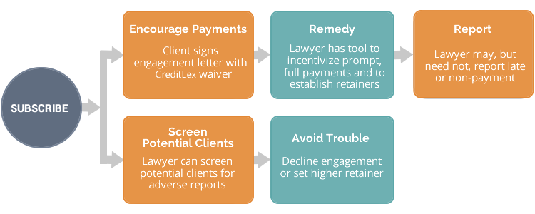 At the start of an engagement, clients will understand that failing to pay could lead to an adverse payment history with CreditLex. This helps level the playing field when a lawyer negotiates retainers and payment terms, allocating the payment risk with new and prospective clients. Clients who pay on time will enjoy the benefits of good credit, such as better terms and lower retainers. Clients who wish to maintain their reputation and standing in the legal community will have a strong incentive to pay their invoices on time.
